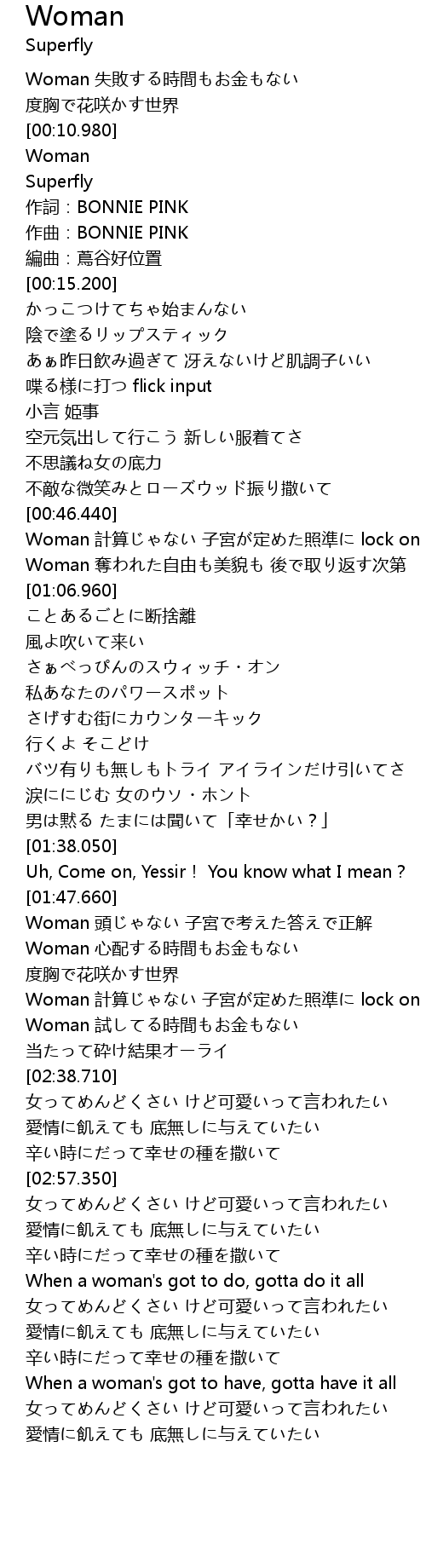 | [02:18.610] | Woman 計算じゃない 子宮が定めた照準に lock on |