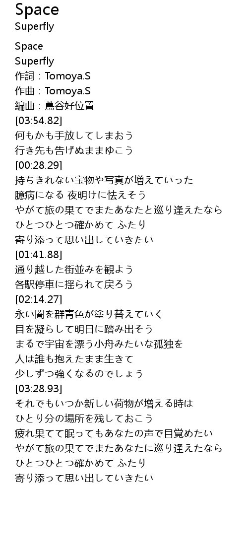 | [02:46.08] | まるで宇宙を漂う小舟みたいな孤独を |