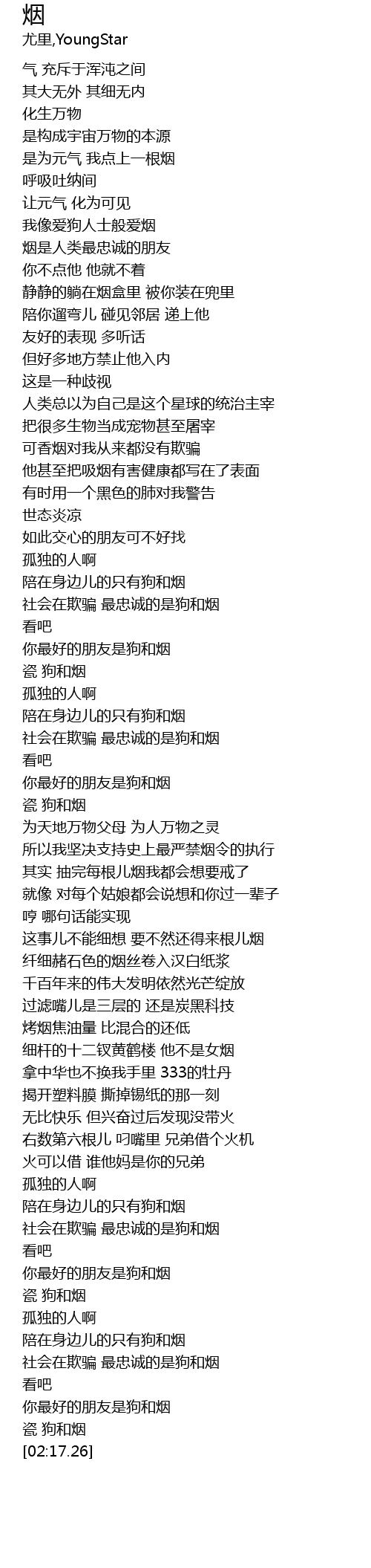 | [01:57.53] | 社会在欺骗 最忠诚的是狗和烟 |