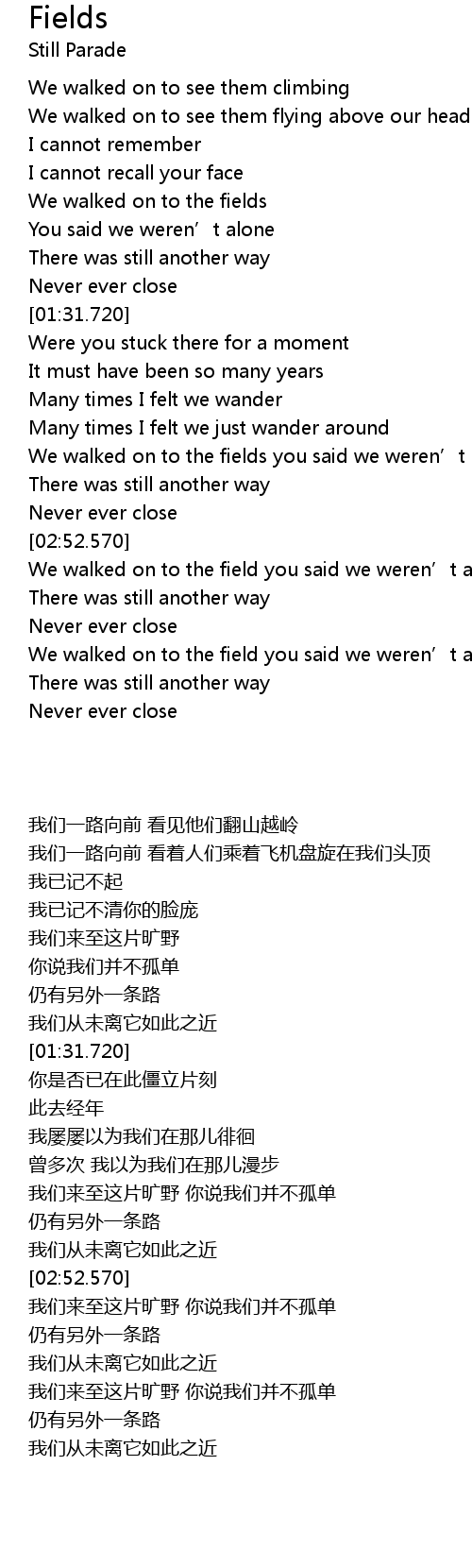 | [02:22.190] | We walked on to the fields you said we weren’t alone |