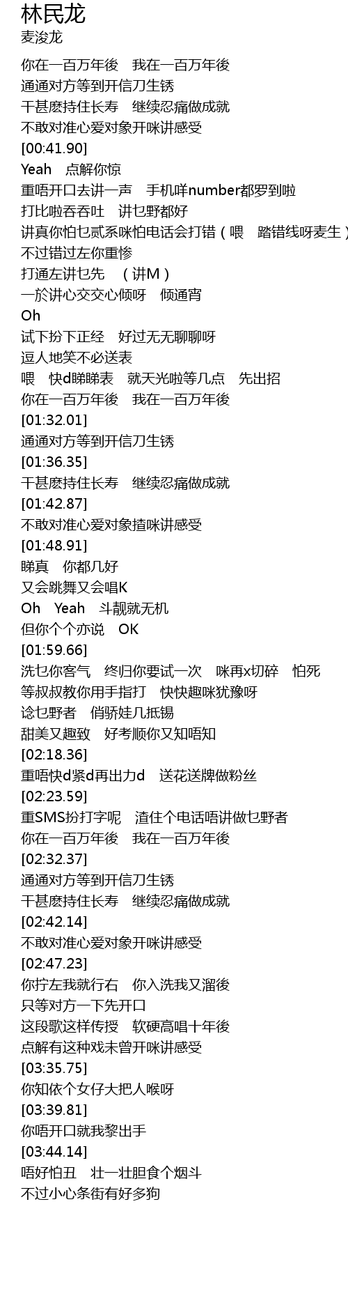 | [01:00.71] | 讲真你怕乜贰系咪怕电话会打错(喂 踏错线呀麦生) |