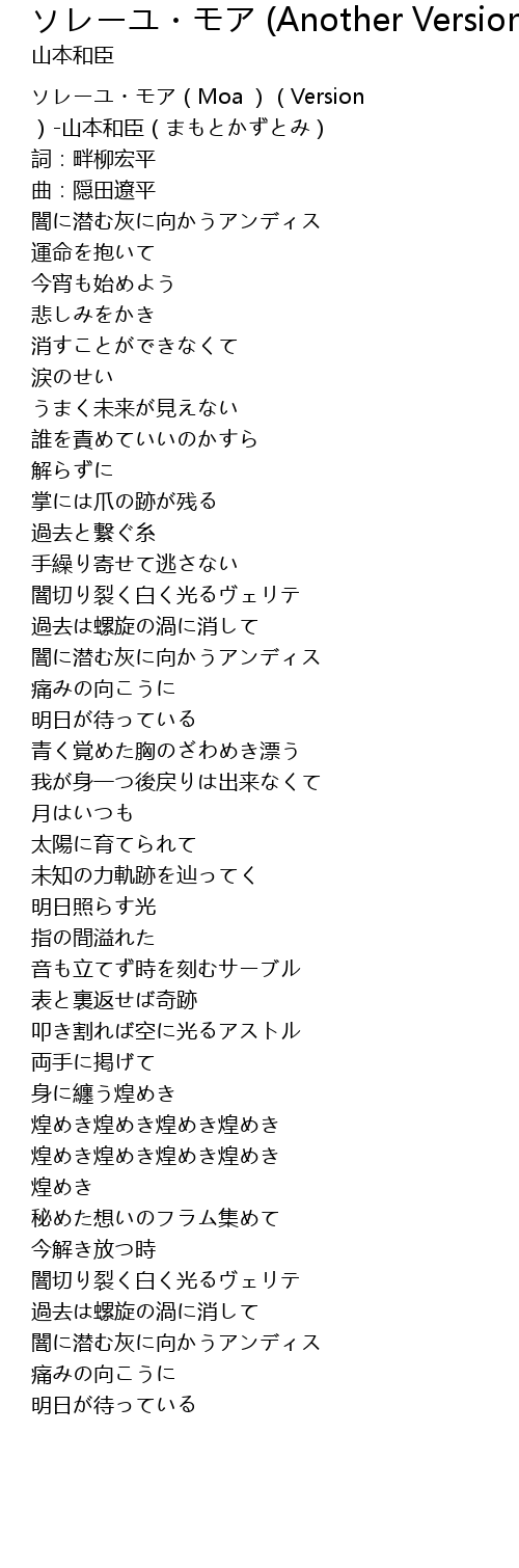 | [00:00.00] | ソレーユ・モア(Moa )(Version )-山本和臣(まもとかずとみ) |