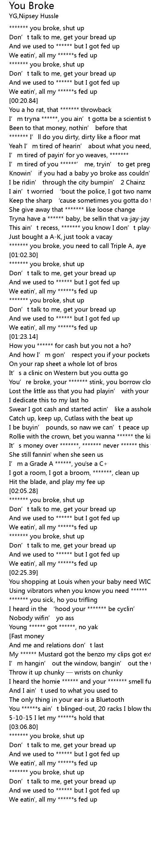 | [01:03.05] | ******* you broke, shut up |