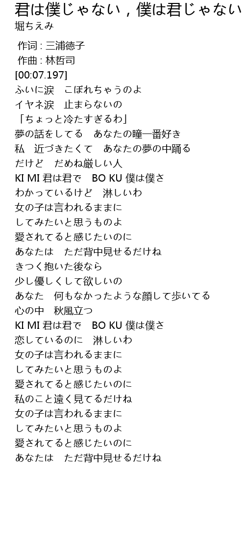 | [01:07.957] | KI MI 君は君で BO KU 僕は僕さ |