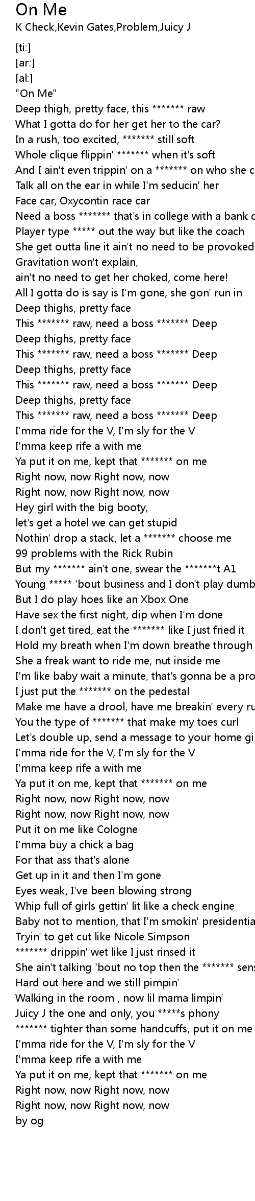 | [02:58.71] | Ya put it on me, kept that ******* on me |