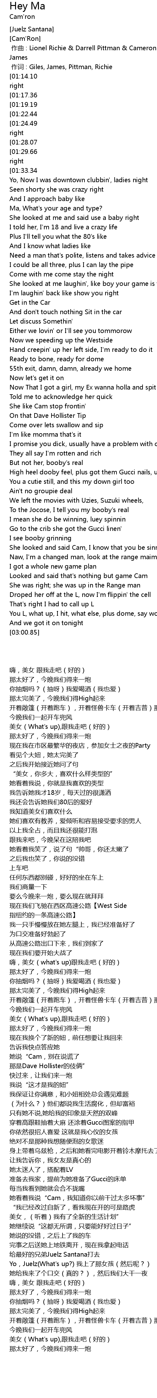 | [02:54.34][01:29.66][00:20.97] | So ma, what's up, let's slide, all right, all right |
