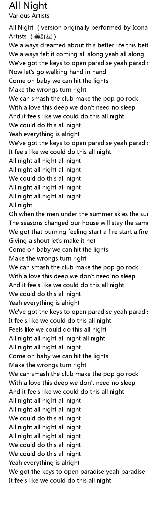 | [00:00.00] | All Night version originally performed by Icona Pop Various Artists měi qún xīng |
