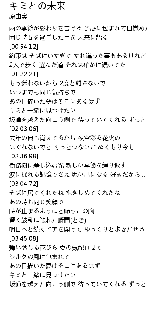 | [01:36.14] | あの日描いた夢はそこにあるはず キミと一緒に見つけたい |