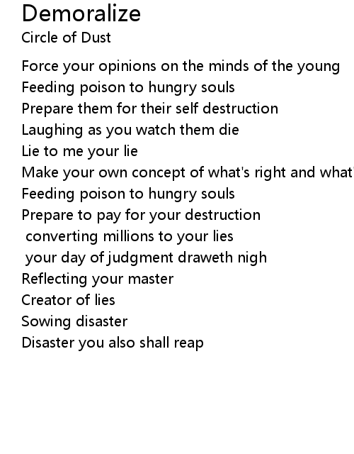 | Your day of judgment draweth nigh [Demoralize] converting millions to your lies [Demoralize] your day of judgment draweth nigh | |