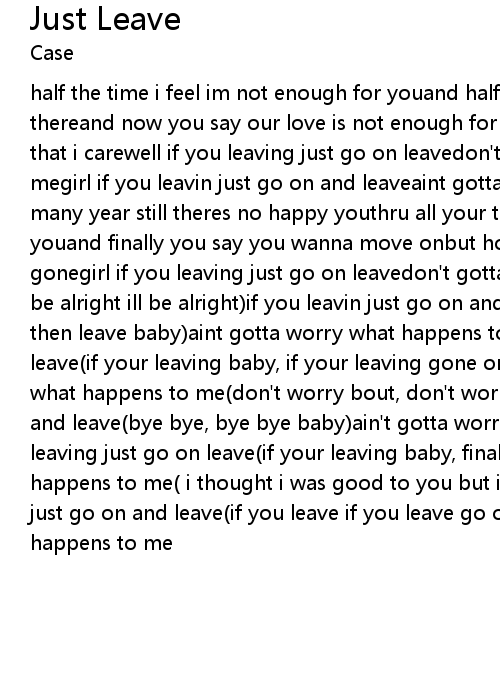 half the time i feel im not enough for youand half the time not even sure your thereand now you say our love is not enough for youand honestly i cant even say that i carewell if you leaving just go on leavedon't gotta worry what happens to megirl if you leavin just go on and leaveaint gotta worry what happens to meso many year still theres no happy youthru all your tears you feel love is draining youand finally you say you wanna move onbut honestly it wont hurt to see you gonegirl if you leaving just go on leavedon't gotta worry what happens to me(ill be alright ill be alright)if you leavin just go on and leave(if you gonna leave then leave baby)aint gotta worry what happens to meif you leaving just go on leave(if your leaving baby, if your leaving gone on and leave)don't gotta worry what happens to me(don't worry bout, don't worry bout)if you leavin just go on and leave(bye bye, bye bye baby)ain't gotta worry what happens to meif you leaving just go on leave(if your leaving baby, finally)don't gotta worry what happens to me( i thought i was good to you but i cause we're thru)if you leavin just go on and leave(if you leave if you leave go on)aint gotta worry what happens to me |
