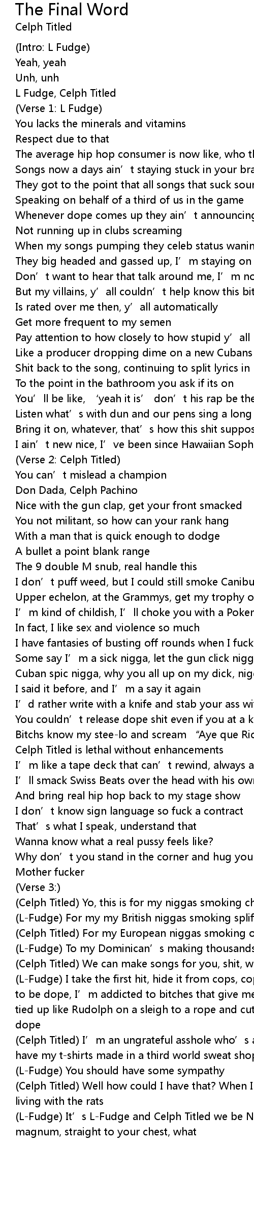 | LFudge It' s LFudge and Celph Titled we be NY' s best, coming four times magnum, straight to your chest, what |