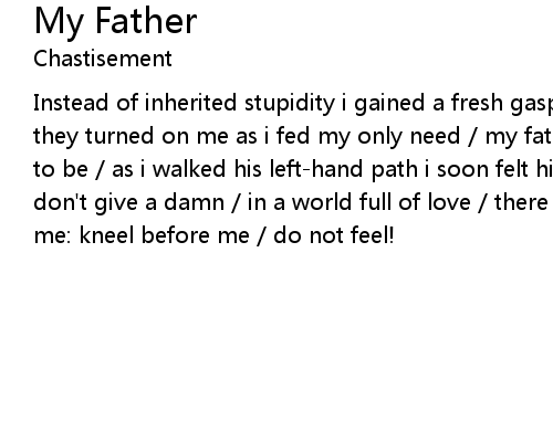 | Instead of inherited stupidity i gained a fresh gasp of humanity / the angels they turned on me as i fed my only need / my father spoke to me / he told me not to be / as i walked his left-hand path i soon felt his wrath / but i as i really don't give a damn / in a world full of love / there could be only one / he told me: kneel before me / do not feel! |