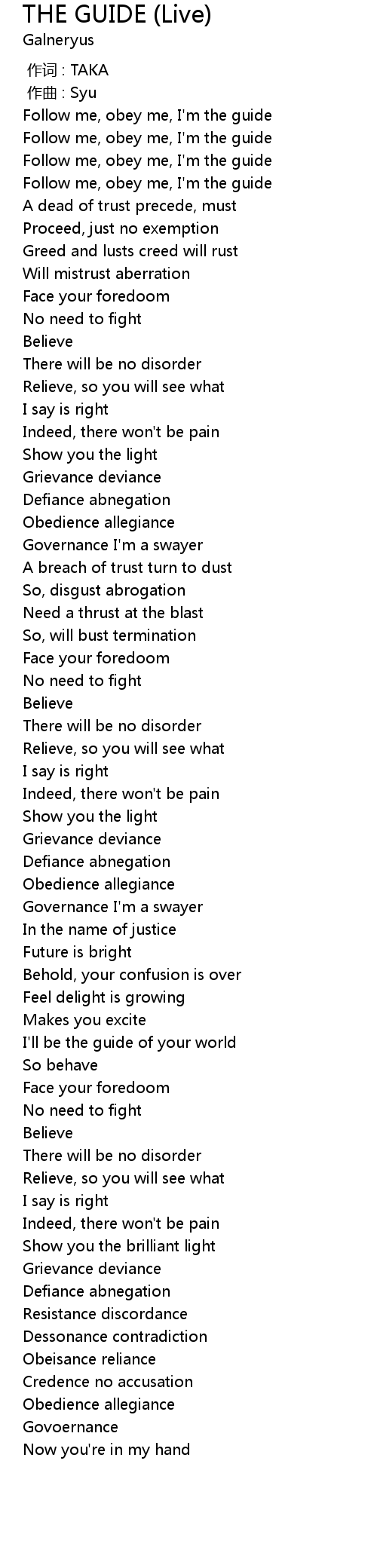 | [00:01.000] | Follow me, obey me, I'm the guide |