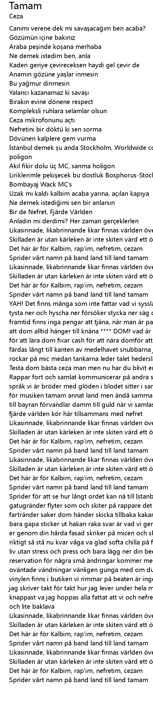 | [02:16.93] | Sprider f r att se hur l ngt ordet kan n till Istanbuls gatugr nder flyter som och skiter p rappare det enda vi l mnar r fartr nder saker dom h nder skicka tillbaka kakan d r fick den som hata smaka bara gapa sticker ut hakan raka svar r vad vi ger er beter er som vi inte ser er genom din h rda fasad skriker p micen och skiter i vilket nu blir det p riktigt s st nu kvar v ga va glad softa chilla p fredligt vis lev ditt liv utan stress och press och bara l gg ner din beef fortfarande samma gamla reservation f r n gra sm ndringar kommer med o ndliga flows mer st ndigt ov ntade v ndningar v nligen gunga med om du k nner dig klockas in i musiken vinylen finns i butiken vi rimmar p beaten r ingen besviken lyriken ta det jag skriver takt f r takt hur jag lever under hela min stil bara rappa snabbt knappast va jag hoppas alla fattat att vi och nefret softar ner med en kopp te och lite baklava |
