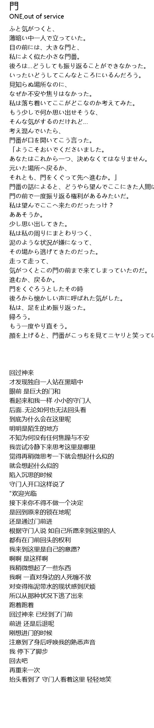 | [01:50.87] | それとも、門をくぐって先へ進むか。」 |