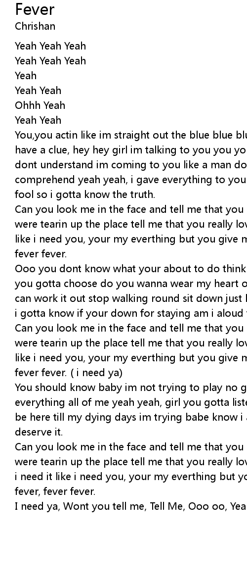 Can you look me in the face and tell me that you really love me the same. when were tearin up the place tell me that you really love me the same. Cuz i need it like i need you, your my everthing but you give me fever, fever fever fever, fever fever.