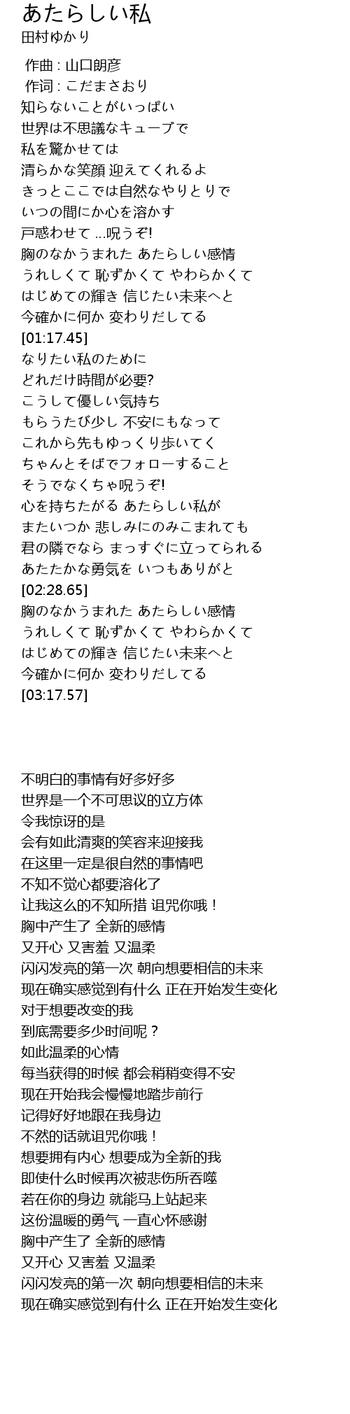 | [03:03.26] | はじめての輝き 信じたい未来へと |