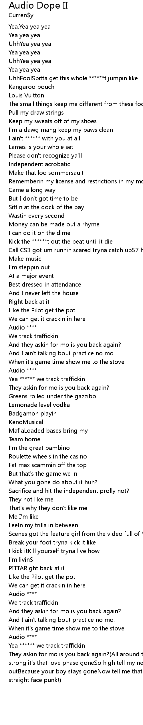 They askin for mo is you back again?(All around the world the same songCali buzz strong it's that love phase goneSo high tell my neighbors thought I moved outBecause your boy stays goneNow tell me that I ain't got it and then keep a straight face punk!) |