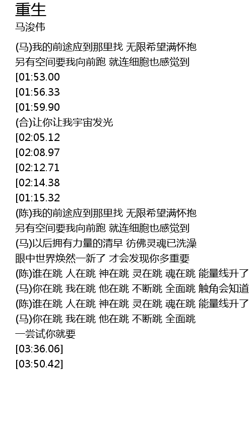 | [03:06.44][01:53.00][00:40.84] | (陈)潜能燃烧 (马)永不会骄傲 |