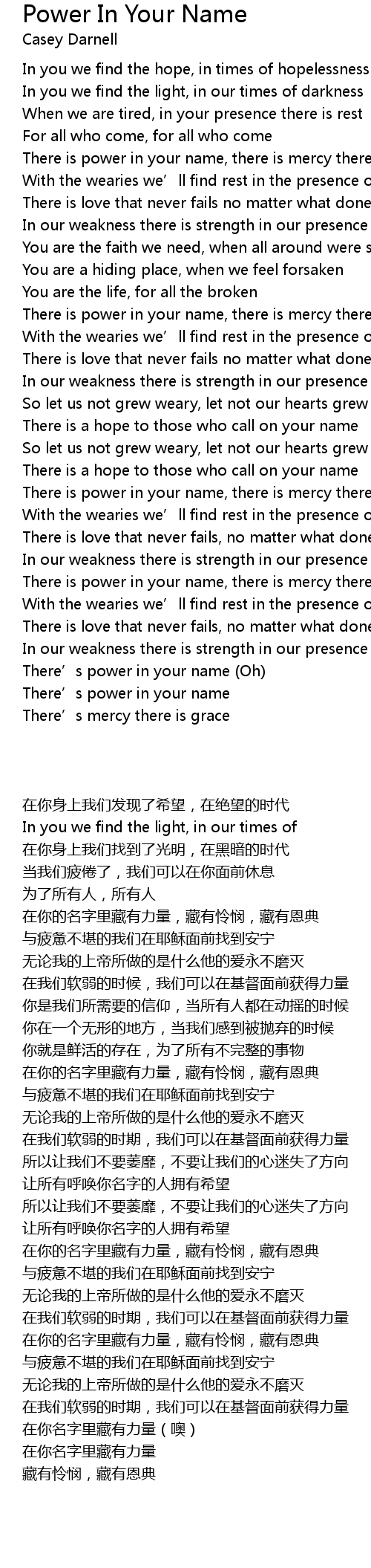 | [02:55.000] | There is power in your name, there is mercy there is grace |