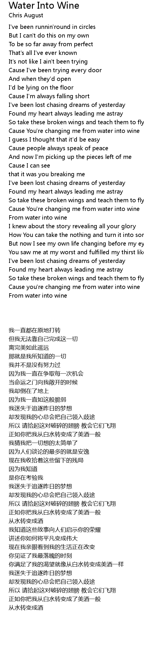 Cause you're changing me from water into wine |