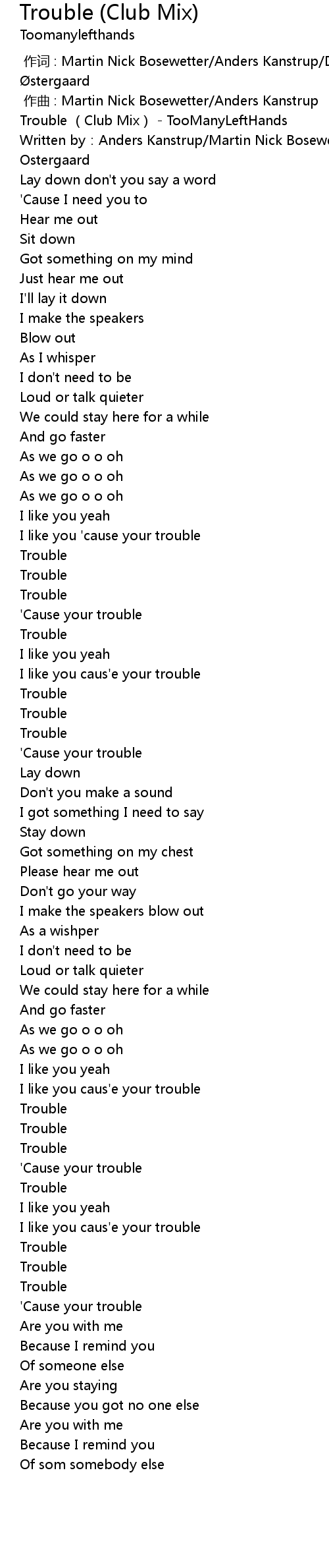 | [00:00.100] | Trouble (Club Mix) - TooManyLeftHands |