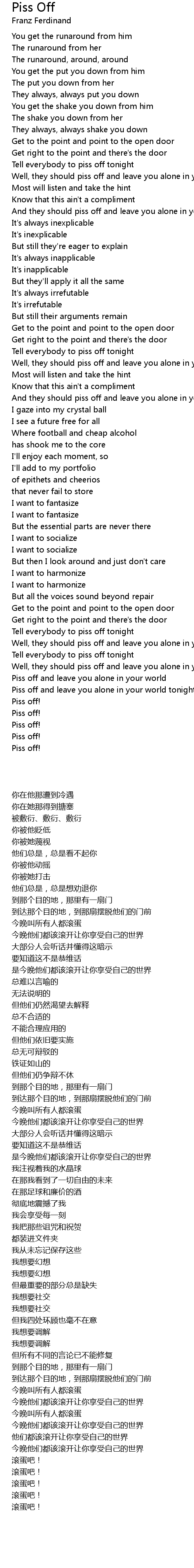 Piss off and leave you alone in your world tonight |