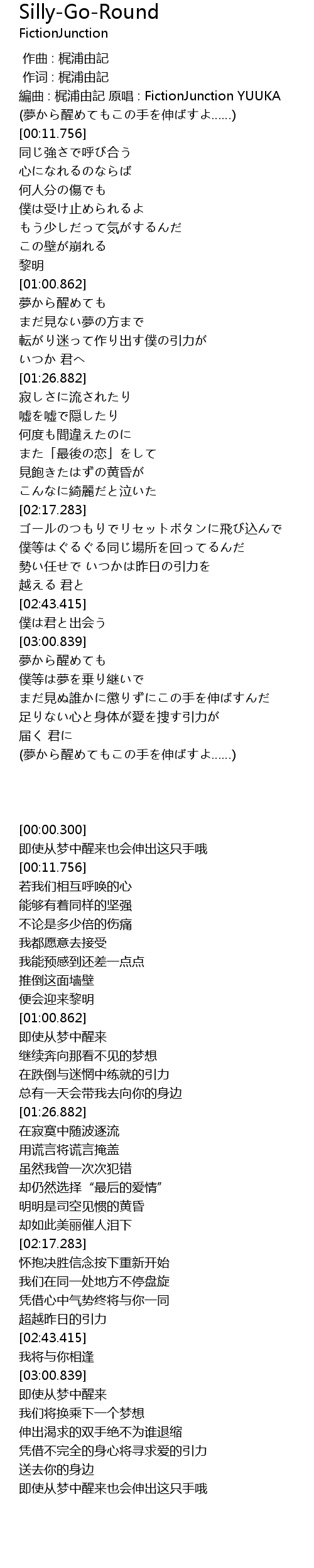 | [00:00.300] | biān qū : wěi pǔ yóu jì yuán chàng : FictionJunction YUUKA |
