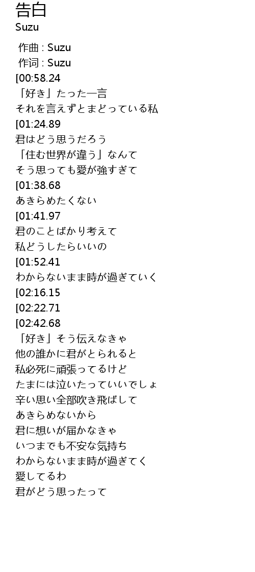 | [00:23.26][01:24.89] | どうしたらいいどう伝えよう |