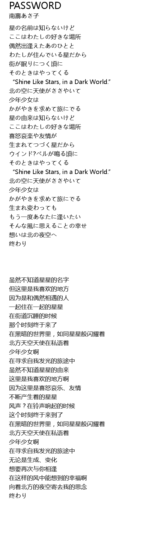 | [02:13.11] | " Shine Like Stars, in a Dark World." |