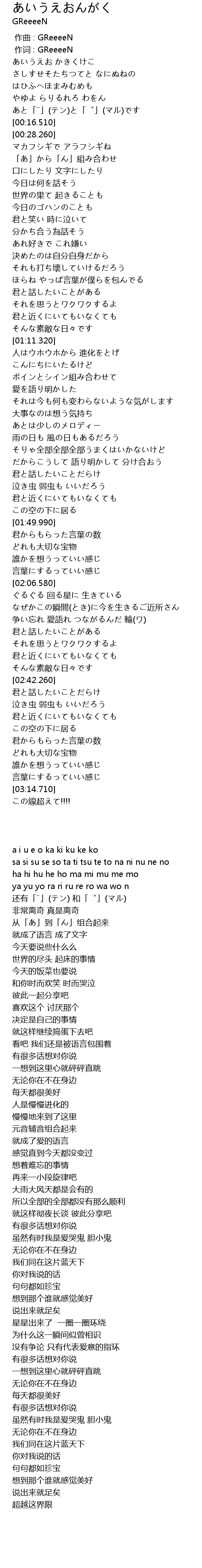 | [00:00.000] | a i u e o ka ki ku ke ko |