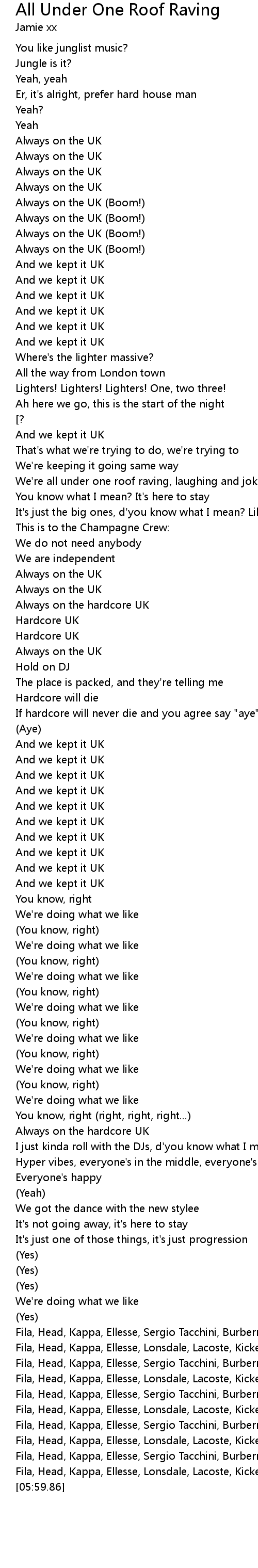 | [05:18.64] | Fila, Head, Kappa, Ellesse, Lonsdale, Lacoste, Kickers, Lees |