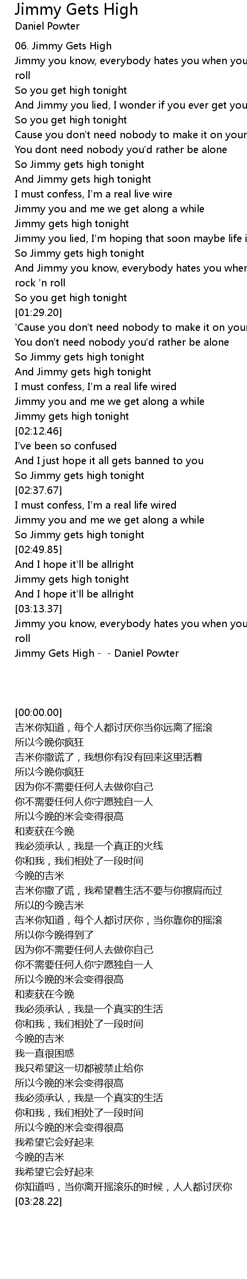 | [03:28.22] | Jimmy Gets High Daniel Powter |
