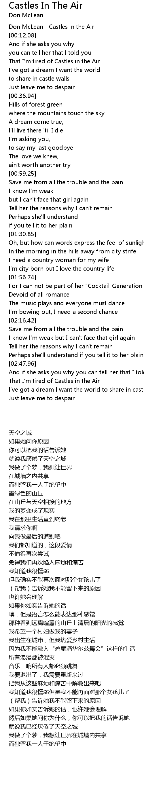 | [00:23.19] | That I'm tired of Castles in the Air |
