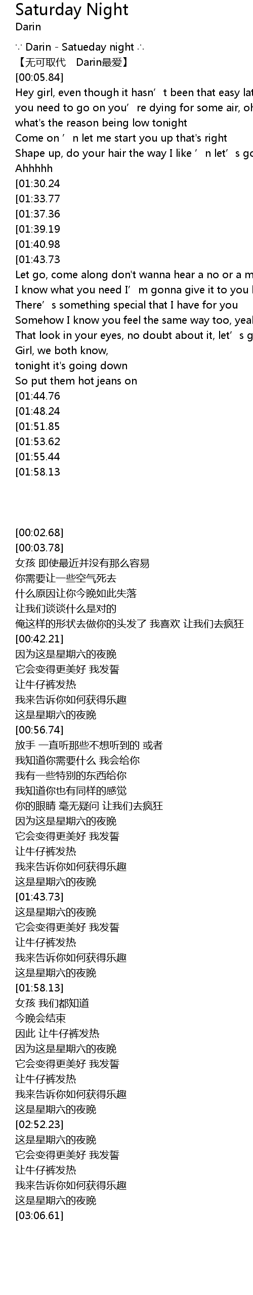 | [02:38.77][01:30.24][00:43.24] | Cause, it' s Saturday night oh yeah |