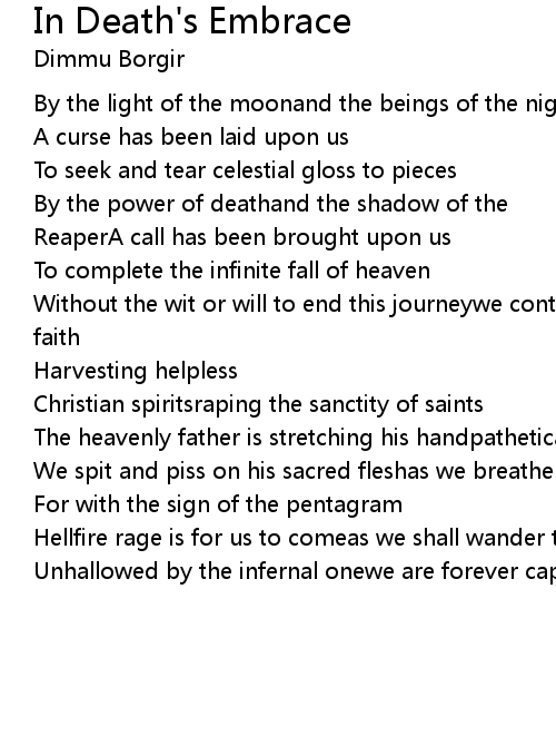 Unhallowed by the infernal onewe are forever capturedby the embrace of death |
