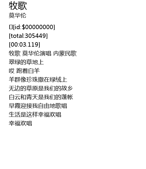| [01:17.222] | 牧歌 莫华伦演唱 内蒙民歌 |