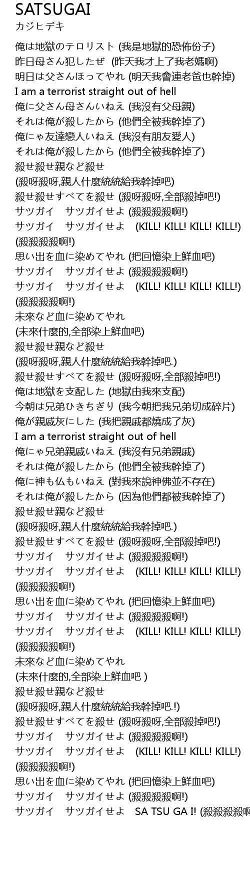 | [02:47.00] | サツガイ サツガイせよ (KILL! KILL! KILL! KILL!) (殺殺殺殺啊!) |