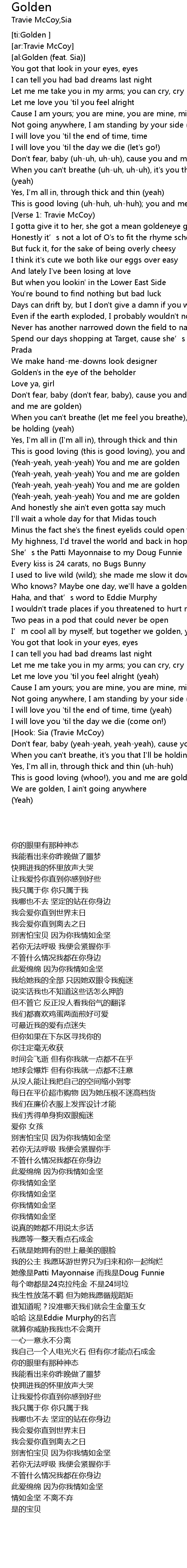 | [01:23.110] | Don't fear, baby (don't fear, baby), cause you and me are golden (you and me are golden) |