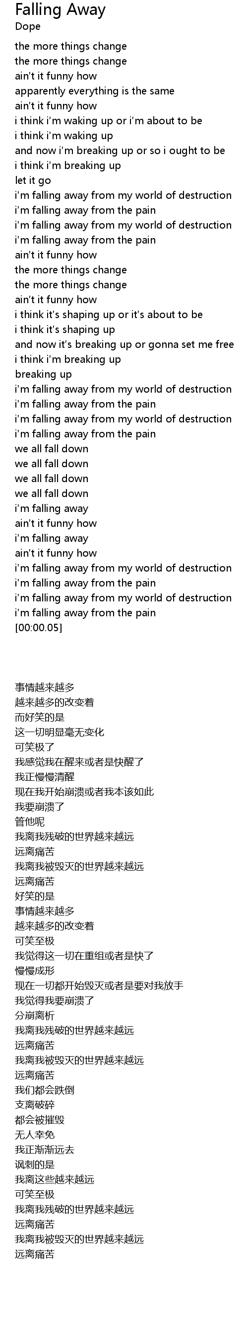 | [00:36.66] | i m falling away from my world of destruction |
