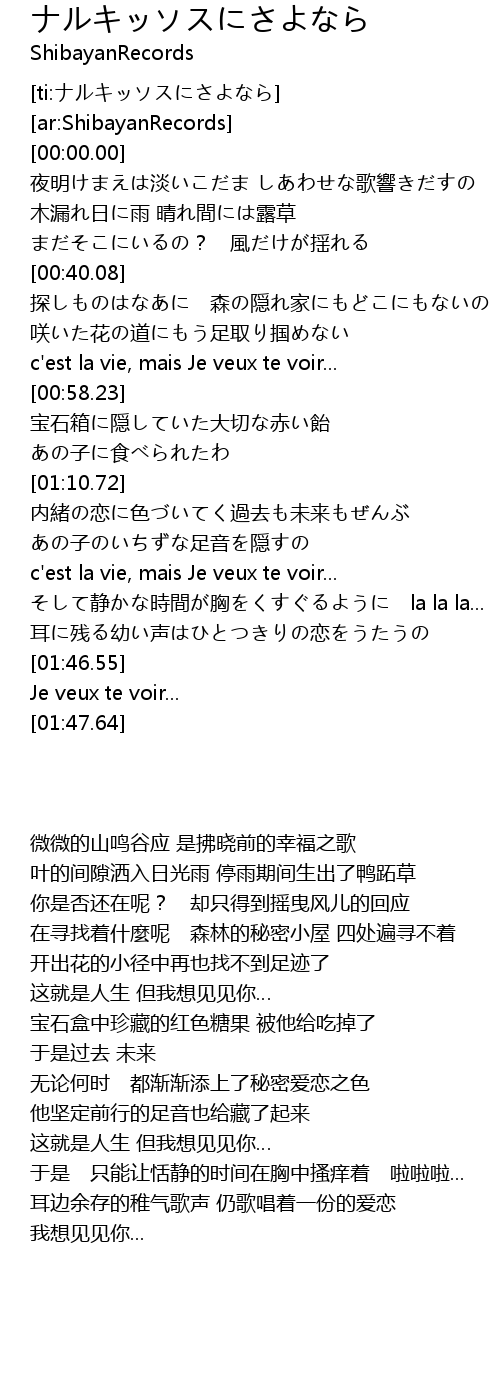 | [00:40.18] | 探しものはなあに 森の隠れ家にもどこにもないの |