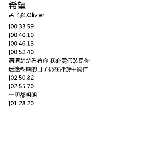| [03:02.67][02:50.82][02:38.52][02:26.21][01:14.46] | 纷飞吧 我的希望 |