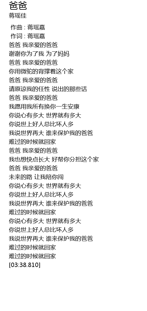 | [03:15.670] | 我说世界再大 谁来保护我的爸爸 |