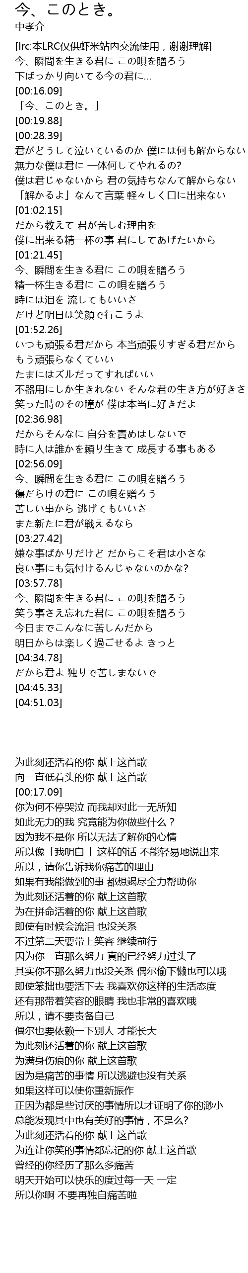 | [02:56.68] | 今、瞬間を生きる君に この唄を贈ろう |
