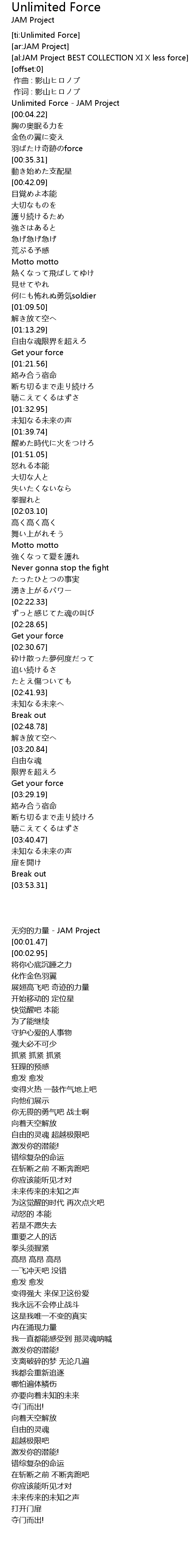 | [00:00.33] | Unlimited Force - JAM Project |
