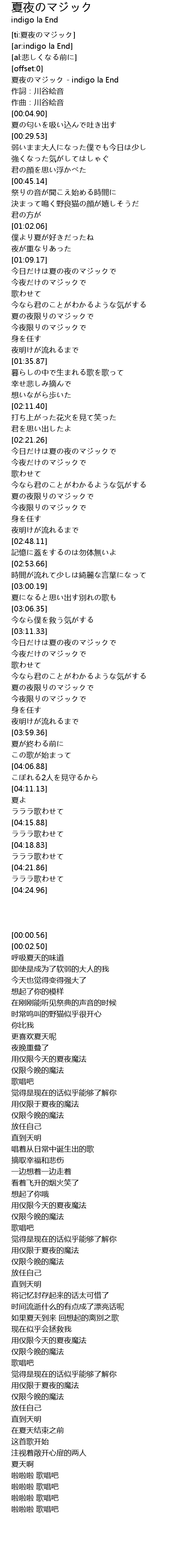 | [00:00.56] | 夏夜のマジック - indigo la End |