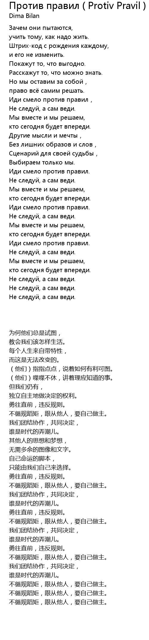 | 歌曲 | Против правил ( Protiv Pravil ) |