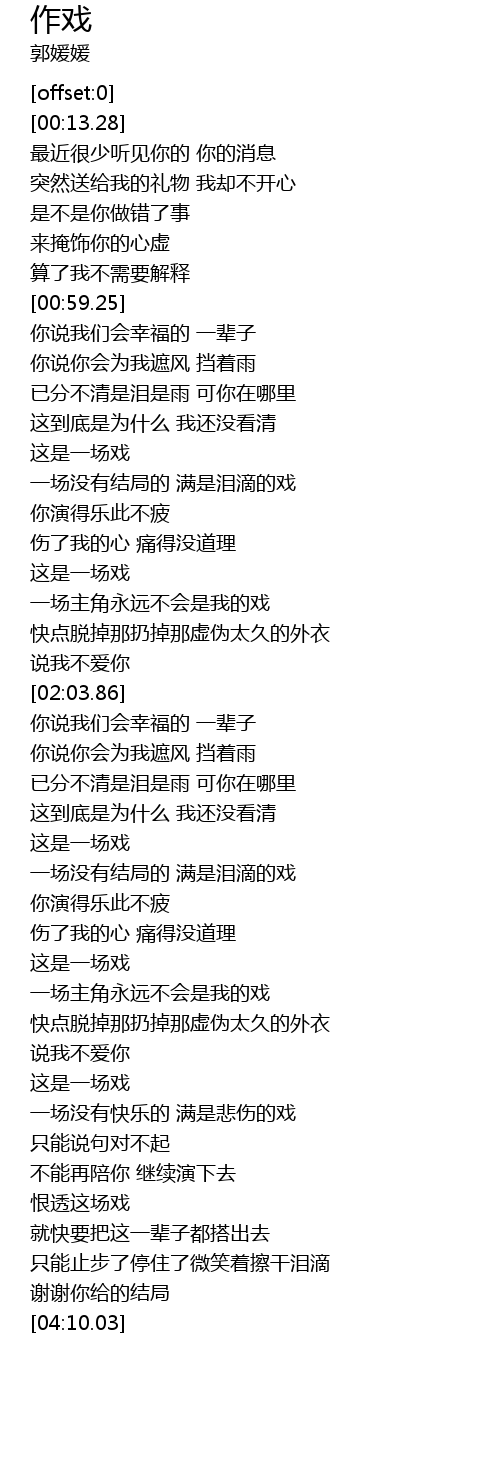 | [03:03.01] | 一场没有结局的 满是泪滴的戏 |