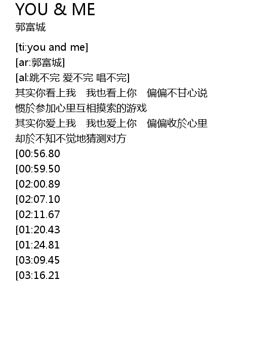 | [03:18.58][03:09.45][02:31.06][01:34.67] | YOU AND ME I LOVE YOU YOU AND ME |