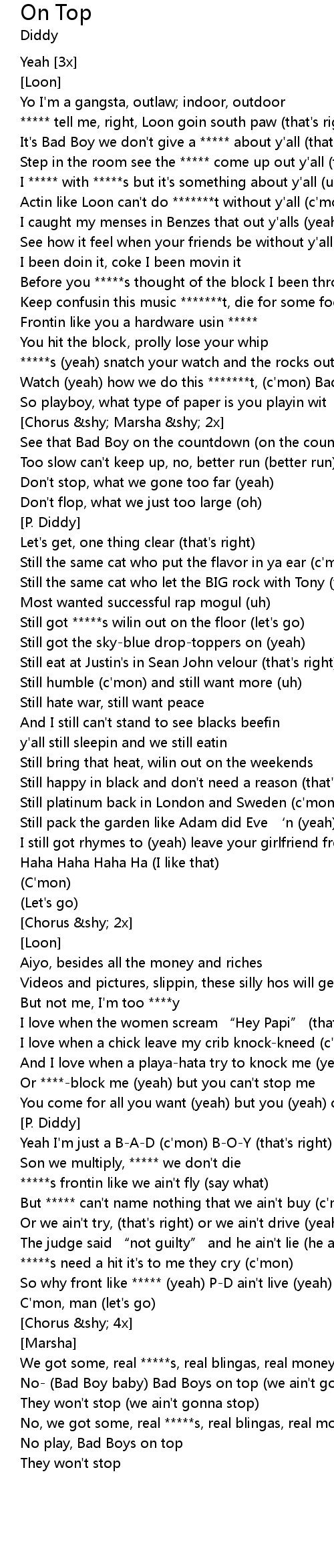 | No- (Bad Boy baby) Bad Boys on top (we ain't goin, we ain't goin) | |